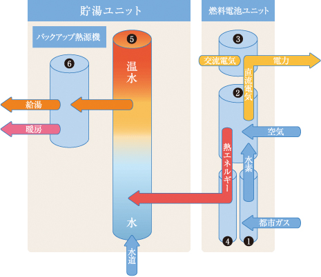 燃料電池の発電原理は水の電気分解の逆プロセス。都市ガスから取り出した水素と空気中の酸素を化学反応させることにより、「電気」と「熱」が生まれます。