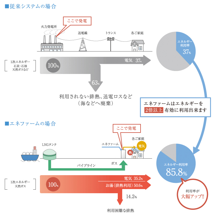 エネファームなら電気を使う場所で発電するので、発生した熱もお湯として使うことができ、エネルギー利用効率を84%まで高めました。