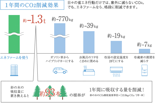 年間の削減量は1.3t。これは、約93 本の杉の木が一年間に吸収するCO2の量に相当します。