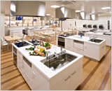 明るくスタイリッシュなクッキングスタジオ。最新のSiセンサーコンロやオーブン、食器洗い乾燥機など、先進のキッチンライフを体感いただけます。講師の手元を映し出すモニターも備え、最新の食情報に敏感なお客さまのニーズにお応えする、充実した料理教室です。