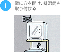 壁に囲まれ、窓や換気扉がない場合に便利な方法です。金属排湿筒を本体の排湿口より延ばし、屋外に面した壁を通して固定し、湿気を排出します。