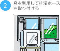 本体設置場所の近くに窓がある場合は、窓パネルを利用して排湿ホースを固定。湿気を排出します。