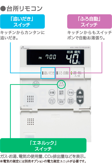 給湯器のガスやお湯の使用量、電力使用量を積算してリモコンに表示。