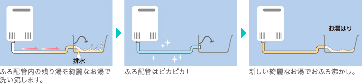 - 浴槽のお湯を排水する際、追いだき配管内の残り湯も、きれいなお湯で洗い流します。