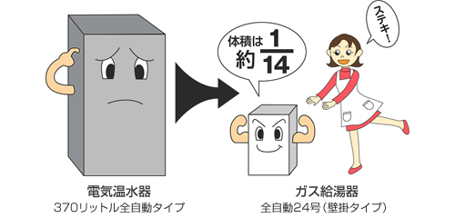 大きな電気温水器からガス給湯器に変えればこんなにコンパクト。スペースを有効に使えます。