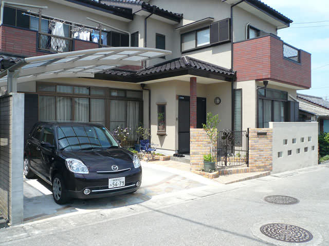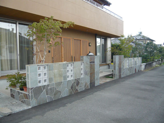 ガレージをレンガタイル貼りにし門扉など西欧風にデザイン。駐車スペースから玄関までのアプローチも確保しました。また、透かしブロック部分もカラフルなガラスブロックにしました。