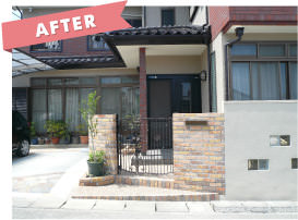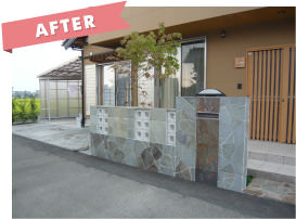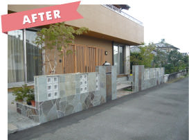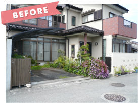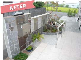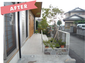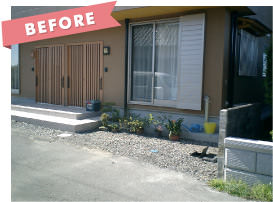 植栽が下段から溢れアプローチ部分を狭めています。駐車スペースが砂利敷のため、雨が降ると足元が悪く大変なうえ、建物が洋風なのに対して透かしブロック等外構は和をイメージさせるデザインでした。